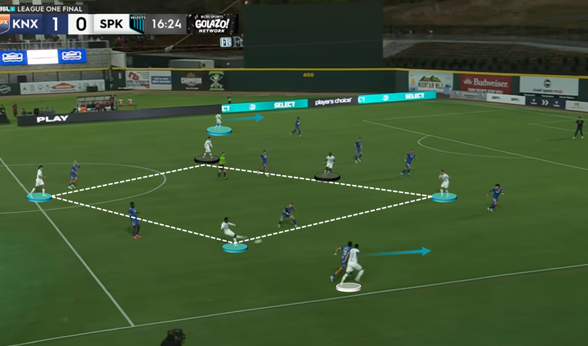 How'd it happen on the pitch? Knoxville re-ran the lineup that got them to a final, but their shape was more of a 4-2-4 than usual. That alignment was dually beneficial. In a pressing sense, using Kempes Tekiela and Babacar Diene as a proper strike pair allowed for two-on-two, face-up coverage against Spokane’s central defenders. Moreover, both forwards could drop for touches in possession, exerting central pressure as wide overloads developed.