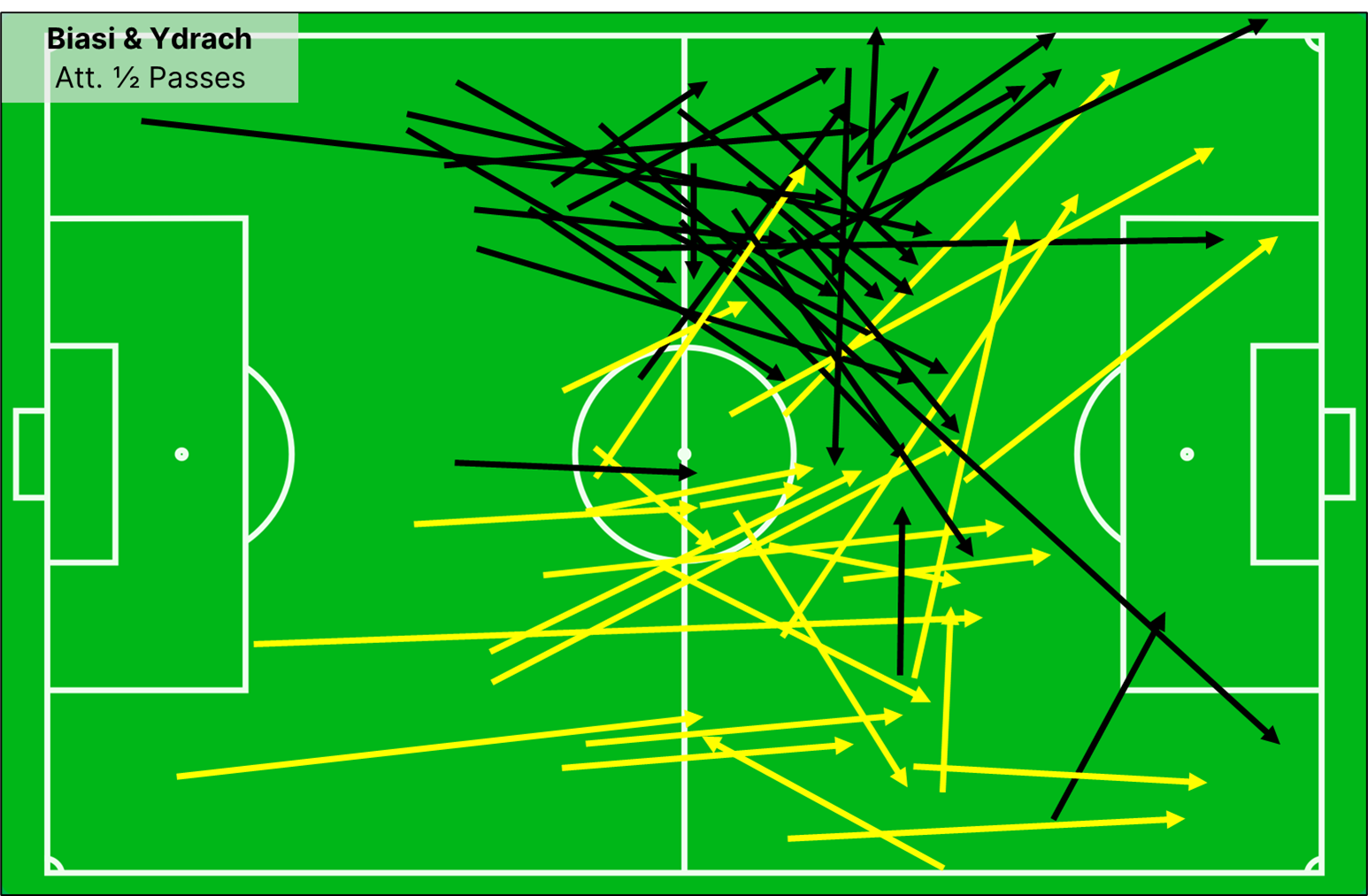 You’re seeing the passes from Ydrach (yellow) and Biasi (black) that ended in the attacking zone here. By any standard, that’s a lot of offensive contributions for defenders! Biasi actually attempted more passes in the Rhode Island half than his own, evidencing a complete territorial victory for the Riverhounds.