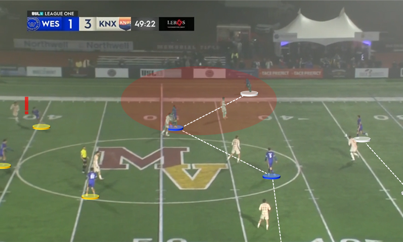 The difference here? Westchester is locked into their structure at every level. No, they don’t create a chance, but the relationships in both a horizontal and vertical sense help bend the One Knox defense and facilitate entry into the 18-yard box.
