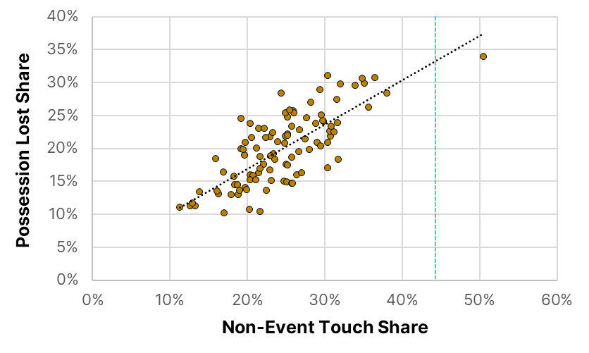 Now, there is a strong correlation between those sorts of touches and possession losses – but predicting someone's return isn't a sure thing, considering an R-squared value of 0.57. Consider the examples of Pierce Rizzo, a young center mid-cum-right back for Phoenix Rising, and Giordano Colli, an energetic No. 10 type for FC Tulsa. Those two turned in identical non-event touch shares (31%) but differed in their turnover rates by a whopping 12%. Both players served a specific role in their club’s system in a way that defied simple statistics.