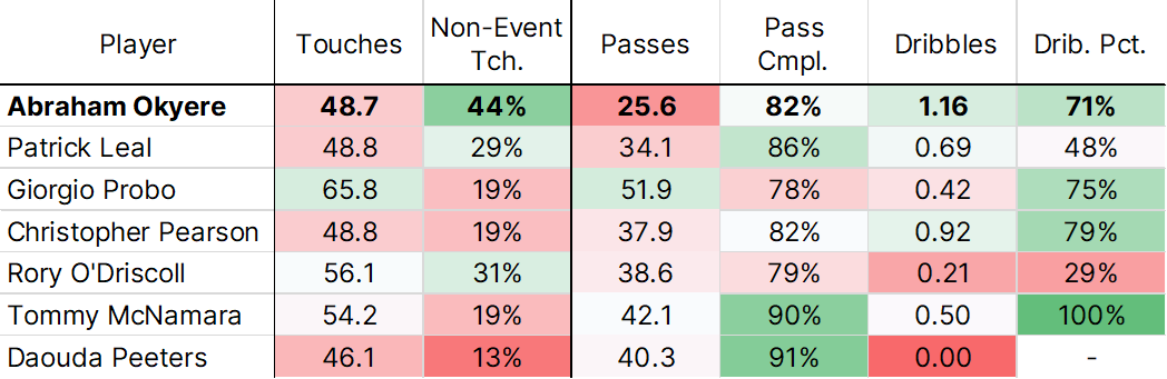 (By the way, Adrian Rebollar is that wild outlier on the far right in the second chart, even further along than the blue line denoting Okyere's numbers. I have no idea what’s up? Rebollar somehow only completed 13 passes a match on a sub-50% dribble success rate, yet my eye test would deem him to be “good.”)