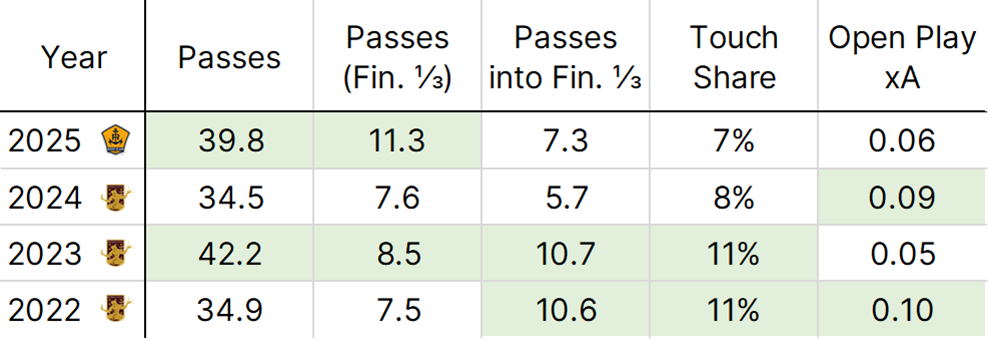 The changing usage was clear in the numbers. Often deployed as a second striker-esque piece in a 3-4-3, Rodriguez took a larger share of his touches in the attacking zone but was much less involved than in his Detroit peak. Meanwhile, his underlying progression and creation numbers declined. That ought to change back at Keyworth – particularly because of Le Rouge’s other business.