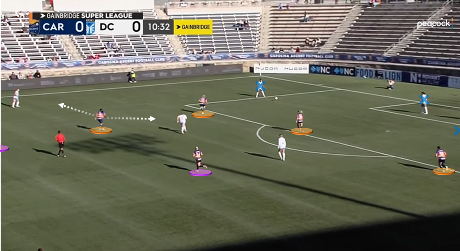 ...with both wingers (Rylee Baisden on the right, Riley Parker on the left, both in orange) shifting high to create parity against the rival back line. Meanwhile, you see forward Mia Corbin (also in orange) tucking inside like a No. 8, giving Carolina three central presences against a Power side known to drop their No. 10s low to create overloads.