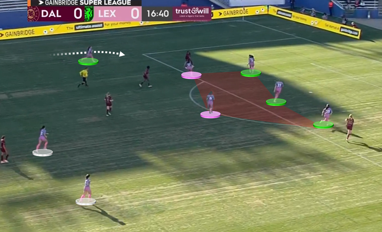 Here, you see Lexington recover in the wake of a less successful press-breaking long ball. An incompletion allows Dallas to break after recovering, yet there's no daylight; the "3-2" resting base of Lexington's shape holds firm, with defensive midfielder Tati Fung shifting deep to cover behind Bourgeois.